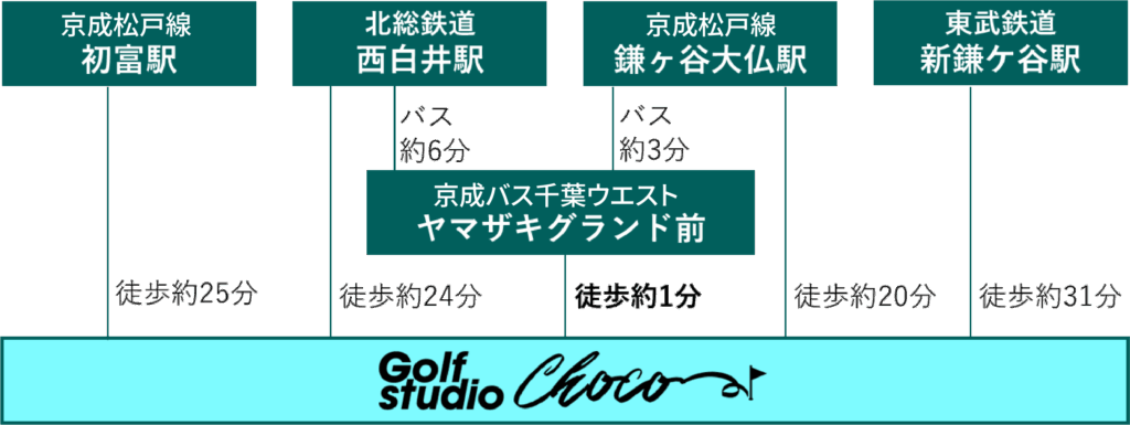 • 鎌ヶ谷大仏駅(京成松戸線)よりヤマザキグランド前(京成バス千葉ウエスト)まで3分+バス停より徒歩1分 / 鎌ヶ谷大仏駅(京成松戸線)より徒歩20分